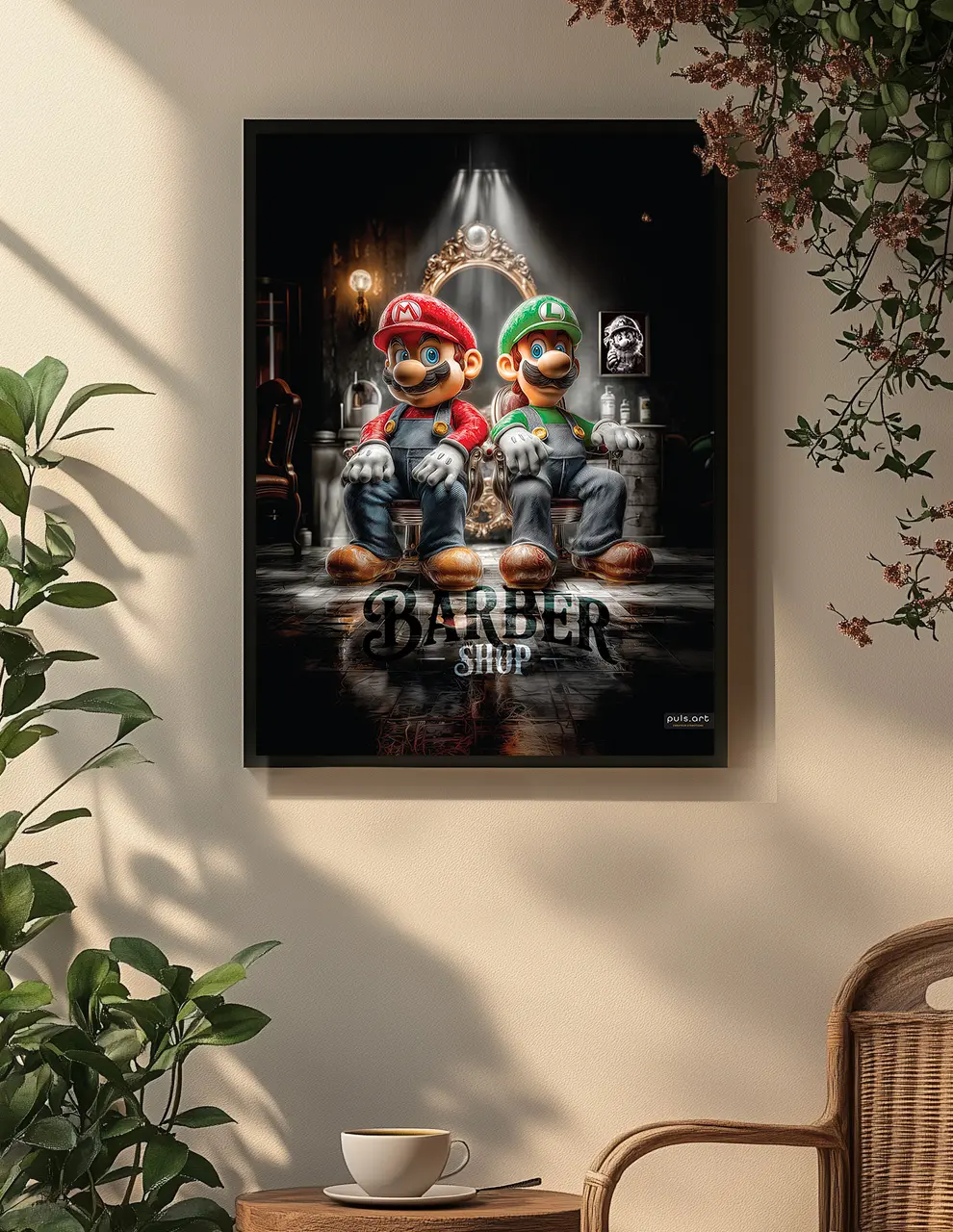 Ici, nos deux célèbres moustachus s’offrent une pause dans un Barber Shop stylisé et lumineux, entre tradition et pop culture. Un clin d’œil fun et décalé qui mêle nostalgie, art contemporain et luxe visuel.