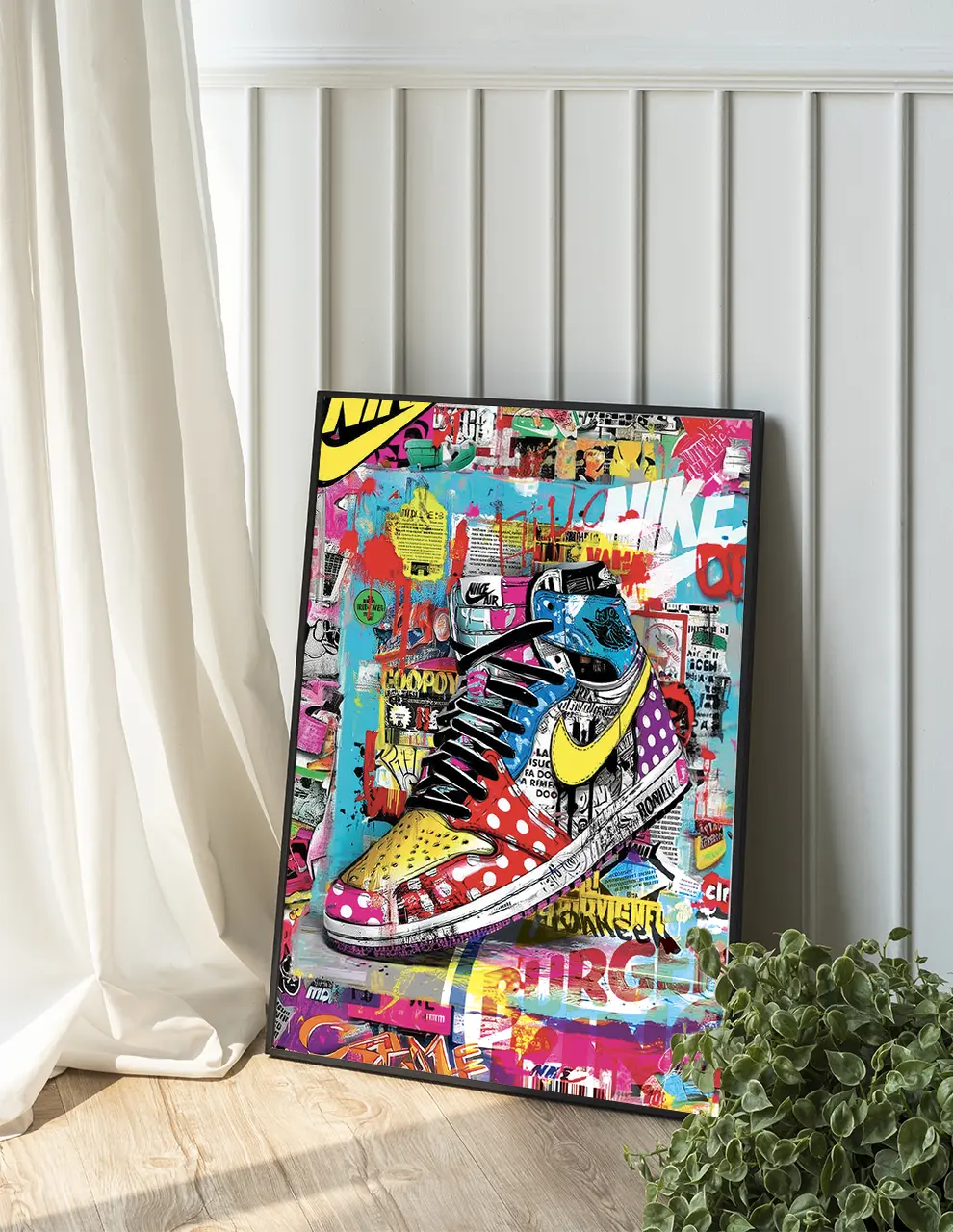 Redécouvrez l'icône intemporelle des sneakers avec cette œuvre explosive, inspirée des légendaires Air Jordan.