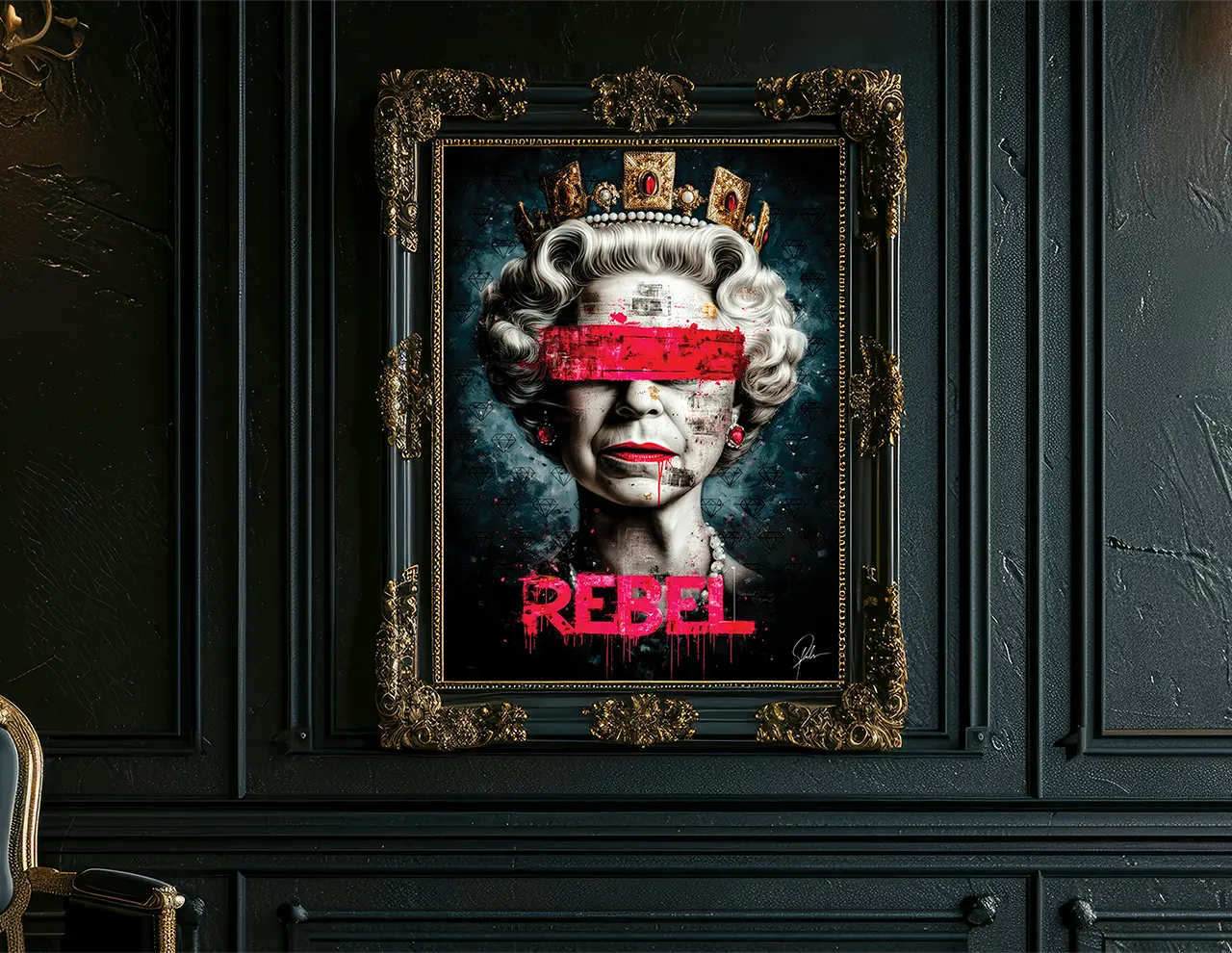 Cette œuvre détourne l’icône absolue du pouvoir pour rappeler qu’être une Reine, c’est aussi savoir bousculer les codes.