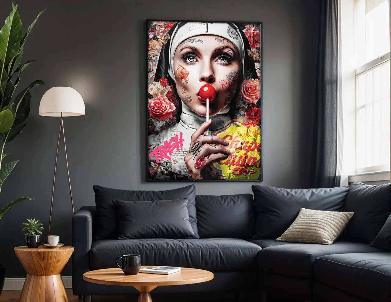 Une religieuse tatouée, un regard qui défie, une sucette Chupa Chups comme un symbole d’ironie —